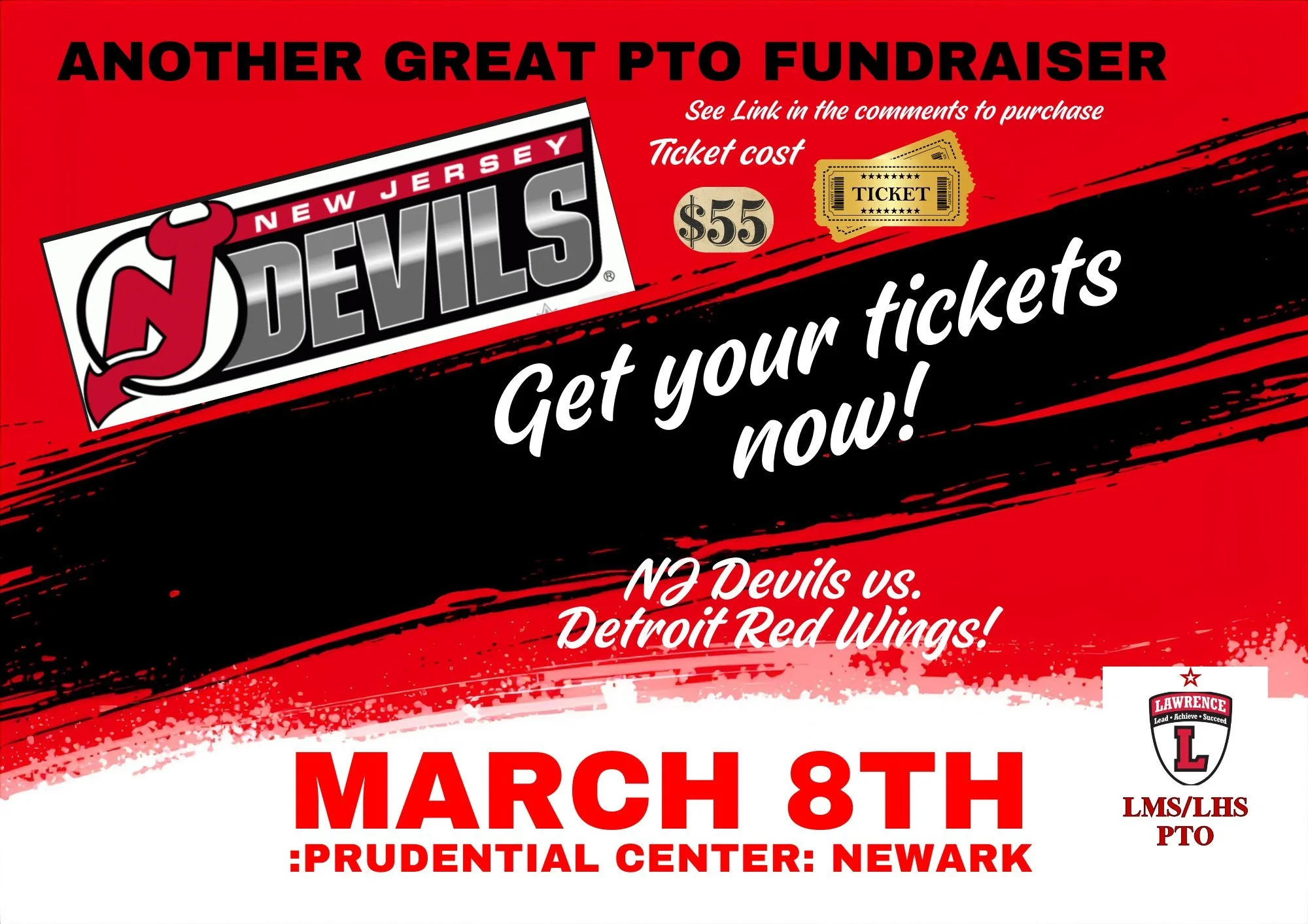 Watch the Jersey Devils take on the Detroit Red Wings on March 8th @7 pm! Get ready for big hits and electric energy—all for just $55! Best of all? A portion of every ticket goes directly to the LMS/LHS fundraiser! Support our schools while cheering on the Devils.